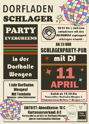 Am Samstag den 11.April in der Dorfhalle Wengen: “Schlagerparty mit DJ, Musik von den „Swingbugs“, eine Tombola,das wird ein Fest!